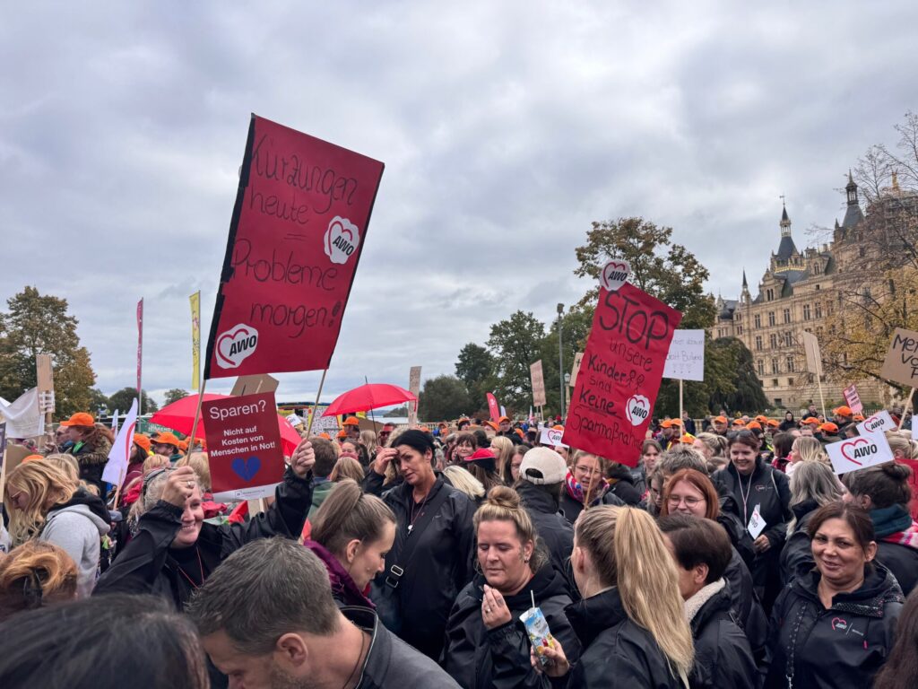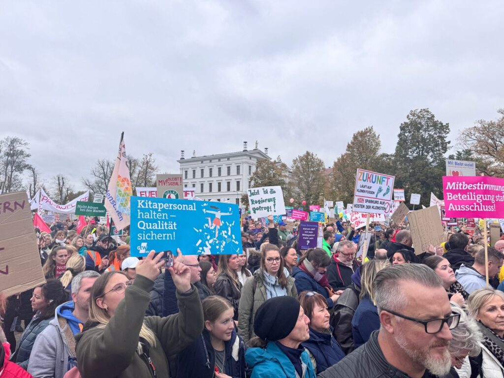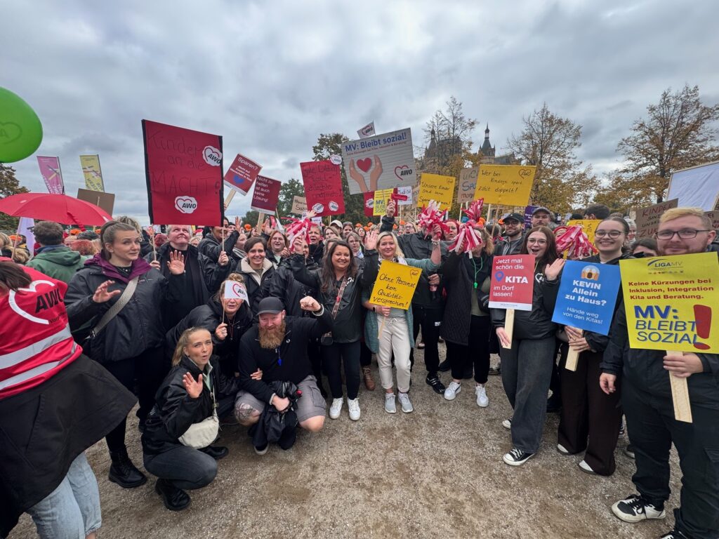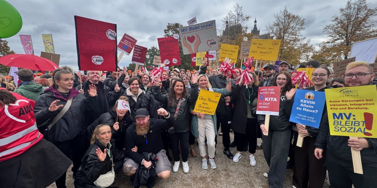 Am Mittwoch fand in Schwerin eine Demonstration gegen die geplanten Kürzungen im sozialen Bereich Mecklenburg-Vorpommerns statt. Zahlreiche Träger, Verbände, Elterninitiativen und Fachkräfte kamen zusammen, um auf die drohenden Auswirkungen der Sparmaßnahmen aufmerksam zu machen – vor allem im Bereich der frühkindlichen Bildung. Auch die MitarbeiterInnen der AWO Rostock waren mit großem Engagement vertreten und setzten ein sichtbares Zeichen für den Erhalt von Qualität, Chancengleichheit und sozialer Verantwortung.