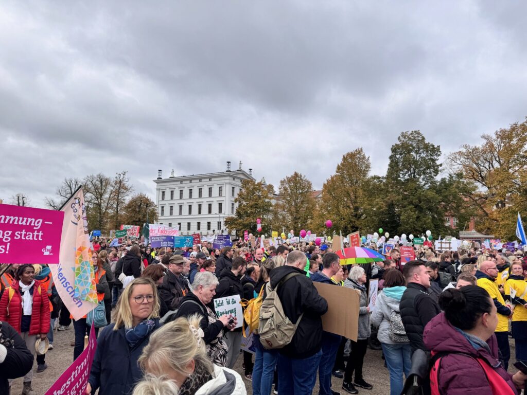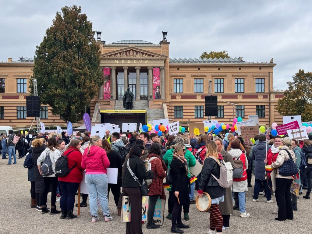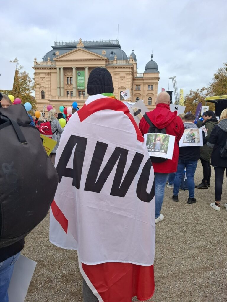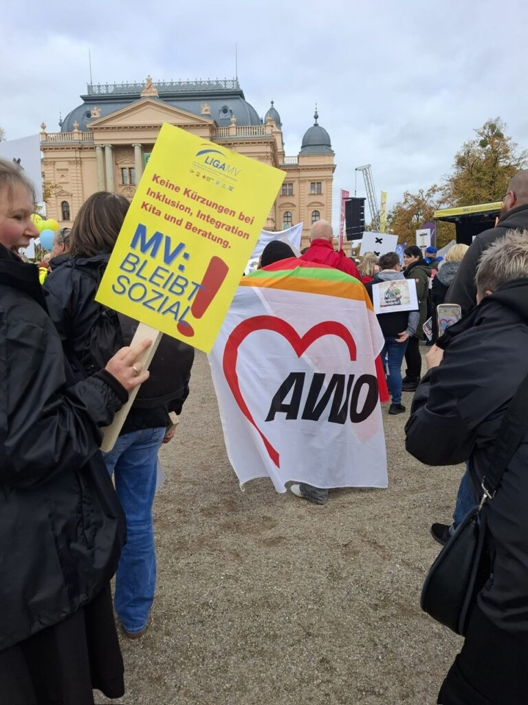 Am Mittwoch fand in Schwerin eine Demonstration gegen die geplanten Kürzungen im sozialen Bereich Mecklenburg-Vorpommerns statt. Zahlreiche Träger, Verbände, Elterninitiativen und Fachkräfte kamen zusammen, um auf die drohenden Auswirkungen der Sparmaßnahmen aufmerksam zu machen – vor allem im Bereich der frühkindlichen Bildung. Auch die MitarbeiterInnen der AWO Rostock waren mit großem Engagement vertreten und setzten ein sichtbares Zeichen für den Erhalt von Qualität, Chancengleichheit und sozialer Verantwortung.