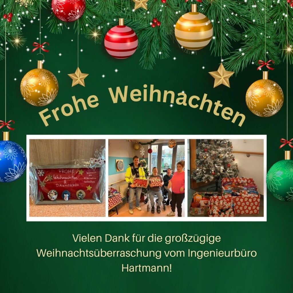 Für die langjährige, verlässliche Unterstützung – sei es durch hilfreichen Rat, tatkräftiges Engagement oder diese großzügige Spende – möchten wir uns herzlich bedanken. Dem gesamten Team des Ingenieurbüros Hartmann wünschen wir eine wundervolle Weihnachtszeit sowie ein gesundes, glückliches und erfolgreiches neues Jahr.