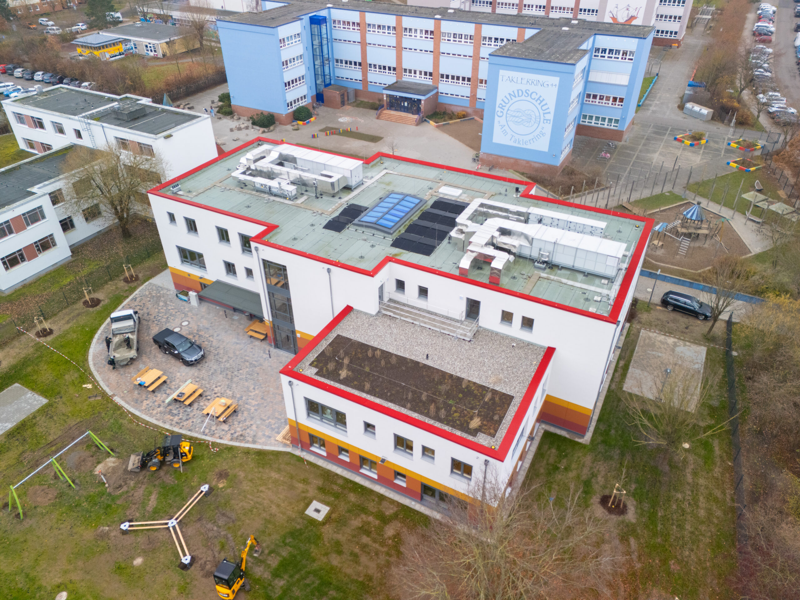 Der Neubau bietet Platz für rund 300 Kinder der Grundschule „Am Taklerring“ und ersetzt die seit 2021 genutzte Containeranlage. Mit dieser Investition reagiert die Hanse- und Universitätsstadt Rostock auf den steigenden Bedarf an Hortplätzen und schafft zugleich die Grundlagen für den künftigen Rechtsanspruch auf Hortbetreuung. Die Gesamtinvestitionskosten belaufen sich auf rund 7,2 Millionen Euro. Das moderne Gebäude überzeugt durch eine nachhaltige Bauweise: Eine Photovoltaikanlage sowie ein teilweise begrüntes Dach unterstützen einen energieeffizienten Betrieb. Der zentrale Eingangsbereich lädt als großzügiger Aufenthaltsbereich zum Verweilen ein. Das barrierefreie Haus verfügt über einen Aufzug und flexibel nutzbare Räume im Erdgeschoss, die vormittags auch für den Schulunterricht zur Verfügung stehen. Zudem bereichert ein multifunktional nutzbarer Speisesaal mit Ausgabeküche das Angebot – dieser kann künftig auch für Veranstaltungen im Stadtteil genutzt werden.