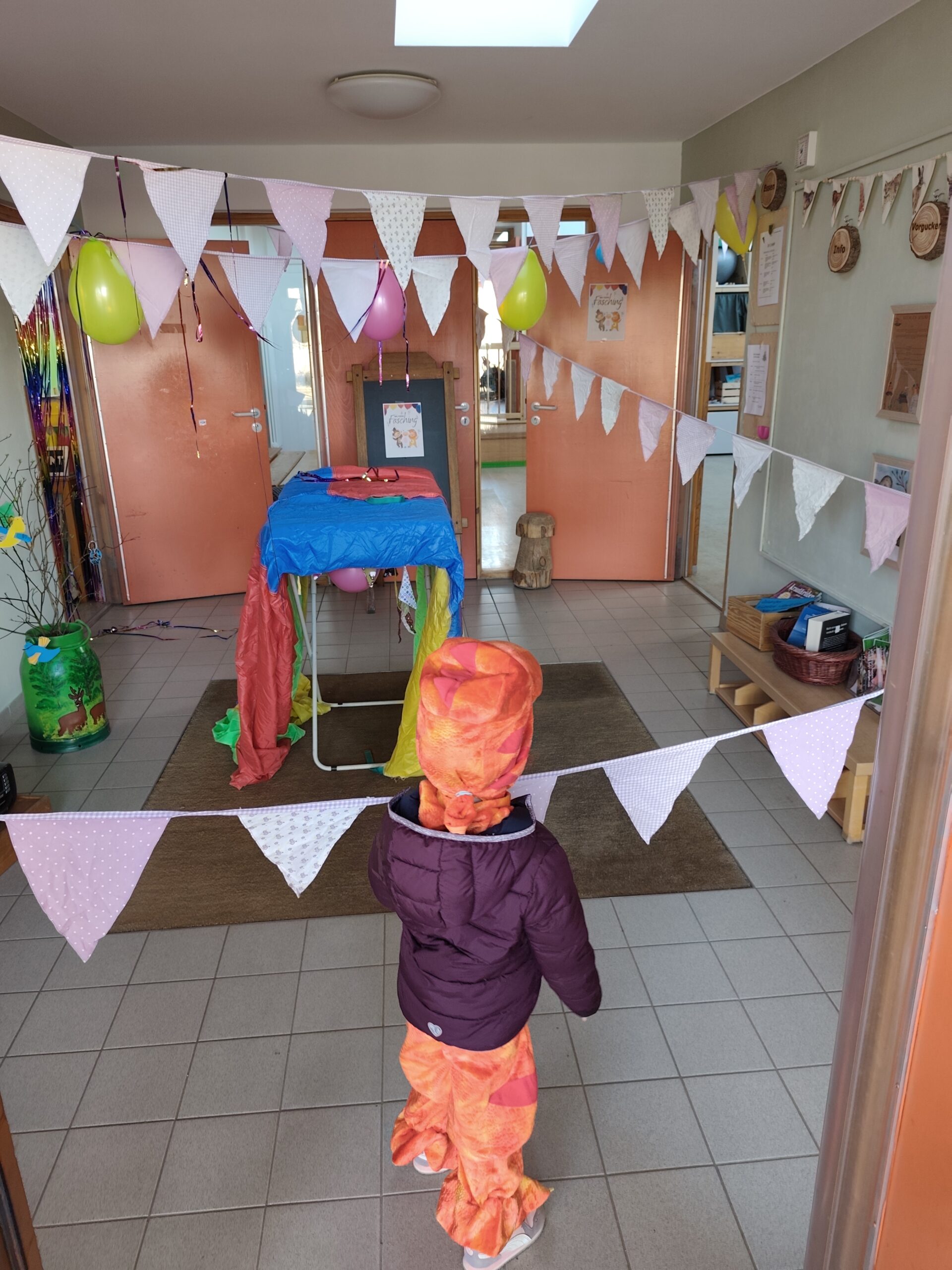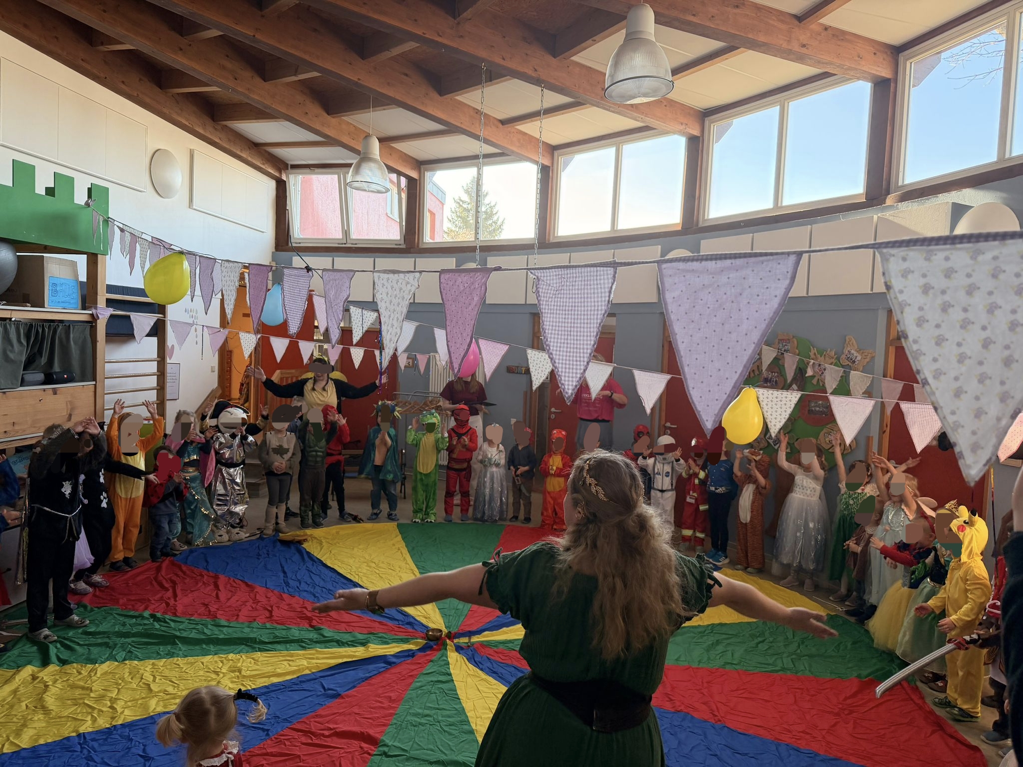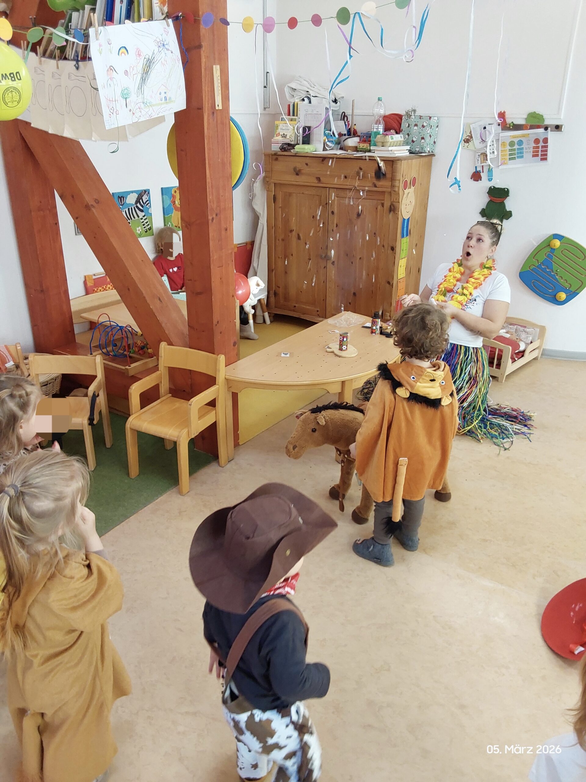 Nach der krankheitsbedingten Absage im Februar konnte der Kindergarten am 5. März 2026 endlich sein lang ersehntes Faschingsfest feiern. Schon beim Betreten des Hauses wurden die Kinder von farbenfrohen Wimpelketten und fröhlicher Musik empfangen, die sofort für ausgelassene Stimmung sorgten. Um 9 Uhr versammelten sich alle Gruppen zu einem großen gemeinsamen Morgenkreis. Die traditionelle Kostümvorstellung bot den Kindern die Gelegenheit, ihre fantasievollen Verkleidungen zu präsentieren – von Tieren über Märchenfiguren bis hin zu mutigen Superheldinnen und Superhelden war alles vertreten. Anschließend wurde gemeinsam getanzt, gelacht und gefeiert.