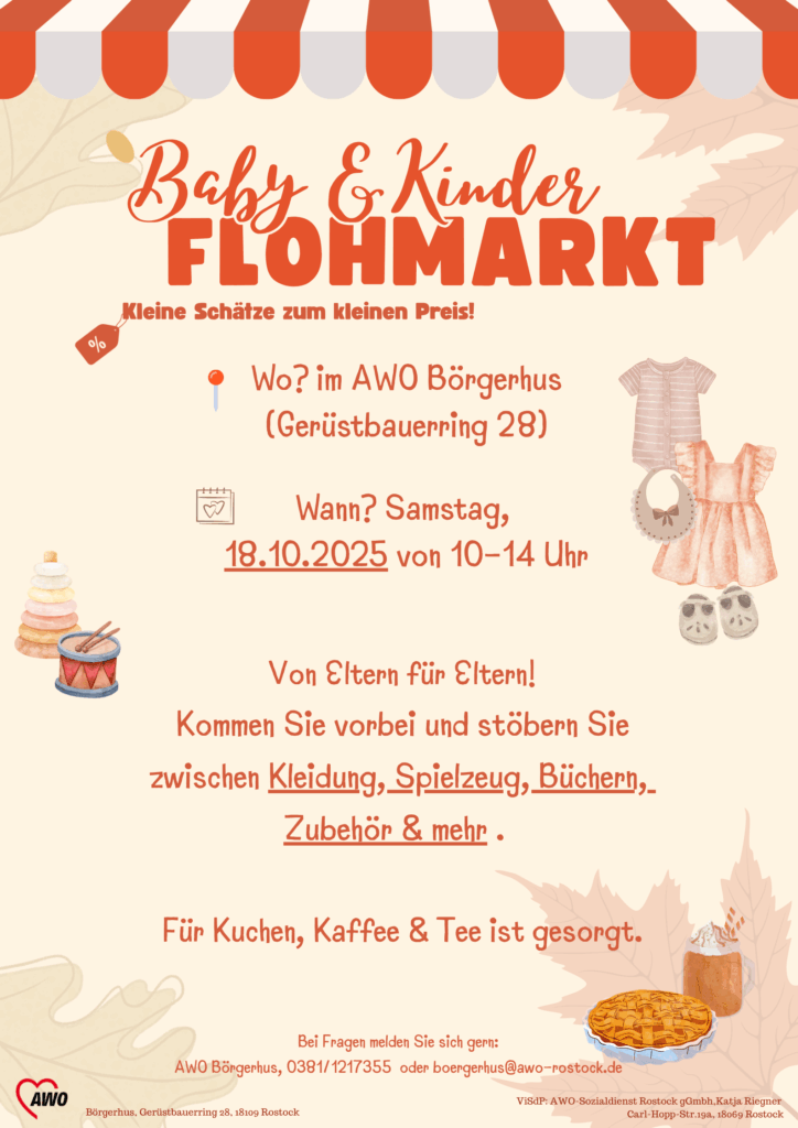 Am Samstag, den 18.10.2025, findet im Börgerhus Groß Klein in der Zeit von 10:00 bis 14:00 Uhr wieder unser beliebter Flohmarkt statt!