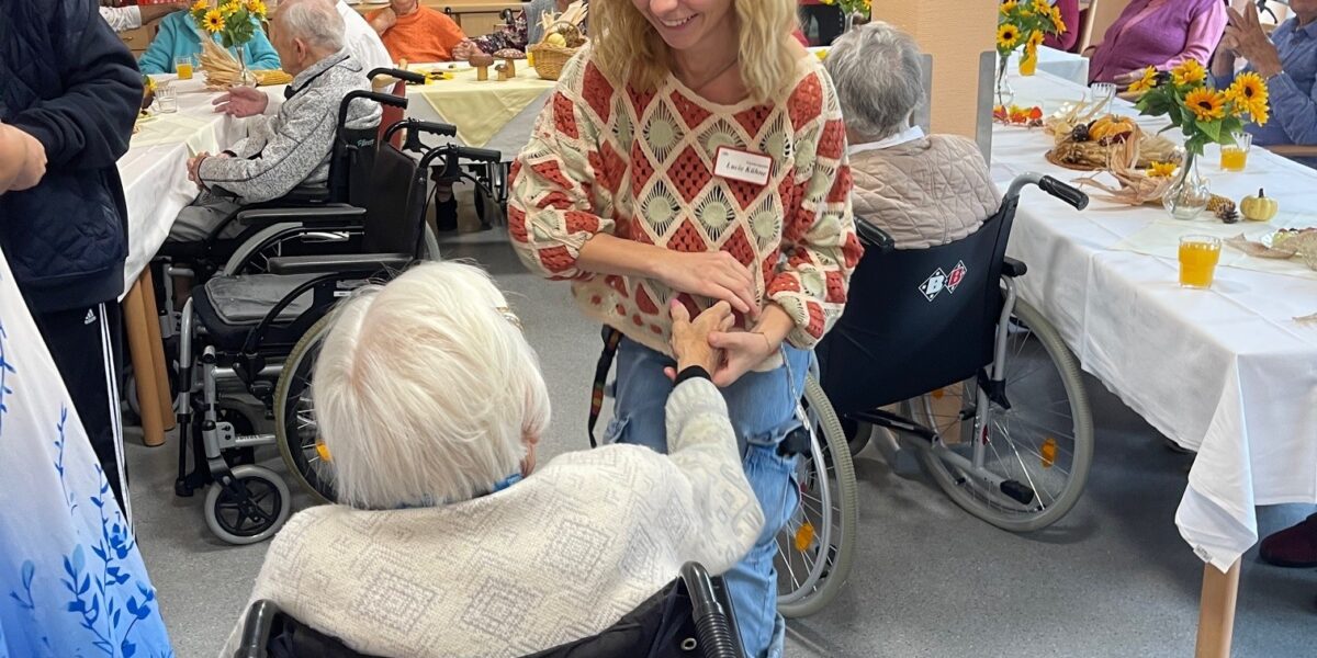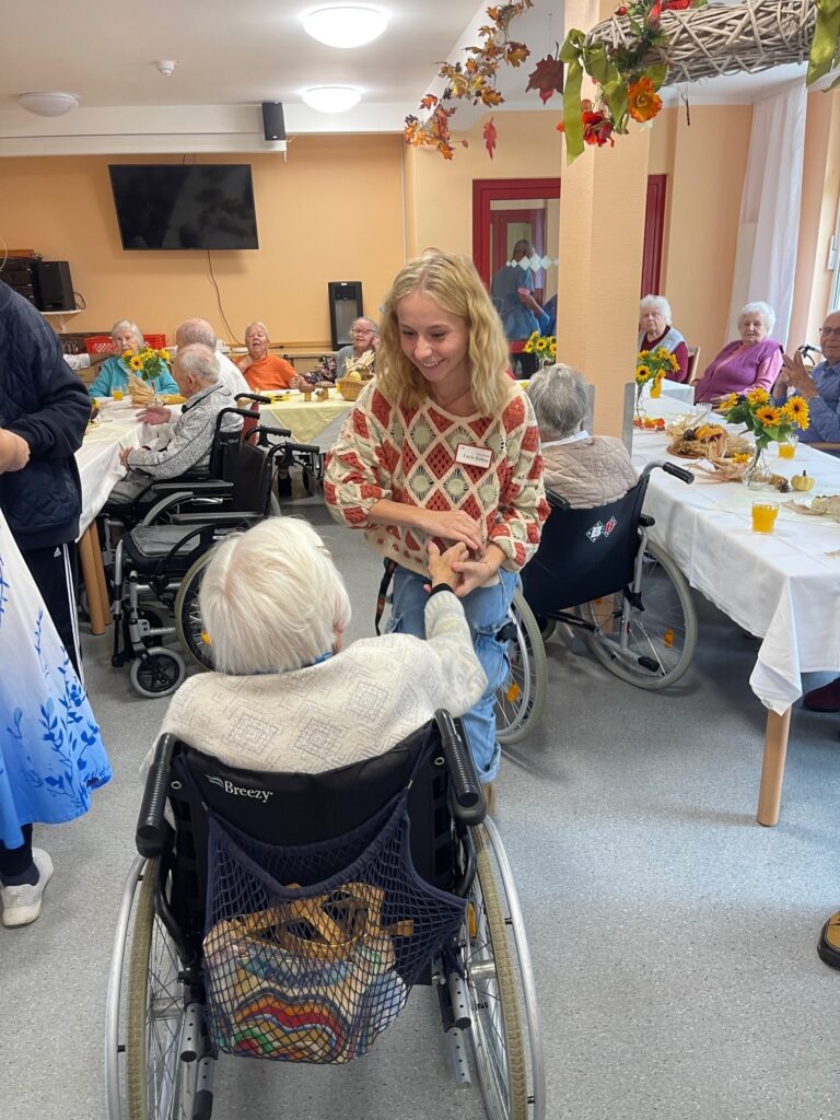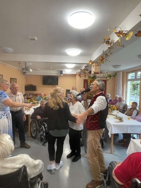 Nur zwei Tage später, am 16. Oktober 2025, fand bereits unser zweites Herbstfest statt, ebenfalls ein voller Erfolg. Dieses Mal verwöhnte die Küche die Bewohner mit frischem Apfelkuchen und einer köstlichen Zitronen-Creme-Torte. Musikalischer Höhepunkt war der Auftritt von Herrn Stein, der mit seiner Stimme und einer Auswahl beliebter Lieder die Herzen der Zuhörer eroberte. Schnell füllte sich der Saal erneut mit guter Laune und gemeinsamer Freude am Singen und Schunkeln.
