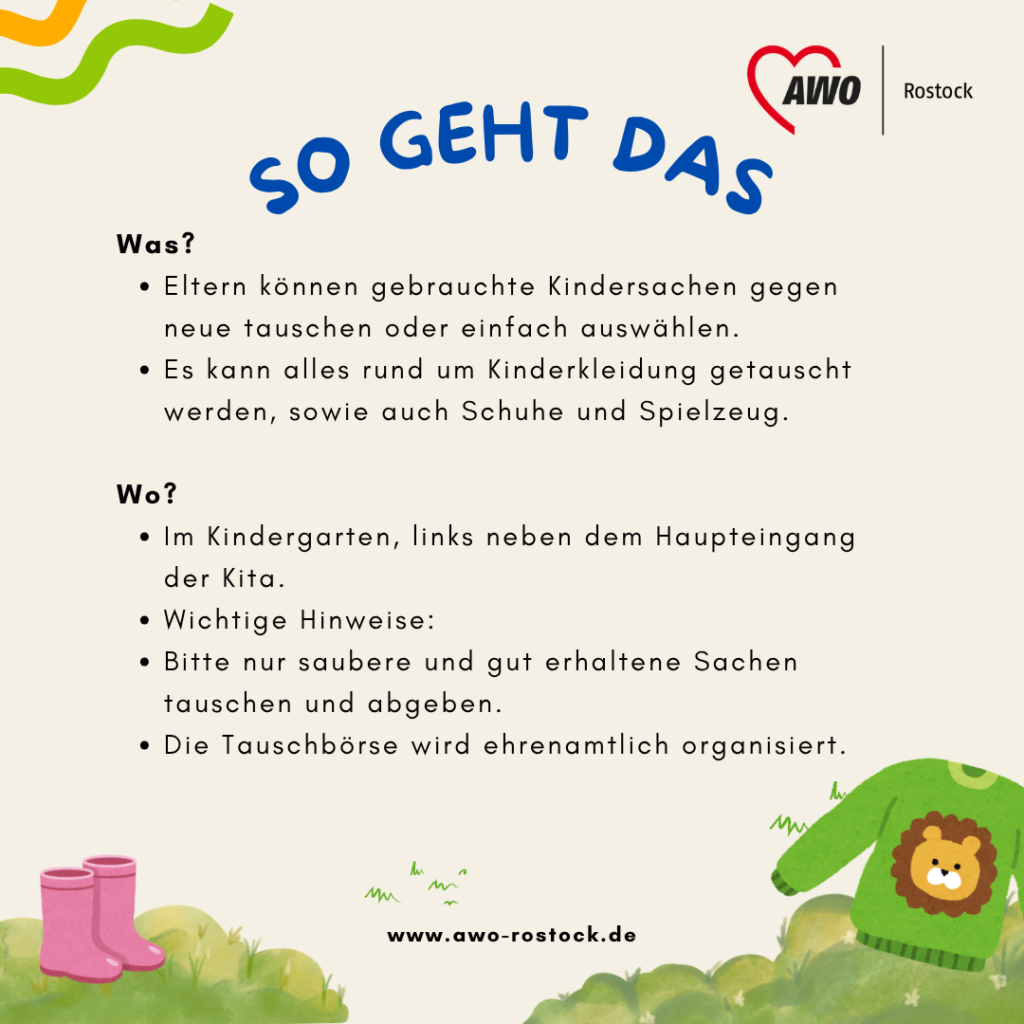 Kinder wachsen schnell aus ihren Sachen heraus, und oft sind Kleidung oder Spielzeug noch viel zu schade für die Tonne. Deshalb bietet die AWO Rostock ab sofort einen neuen Treffpunkt für Eltern an: Unsere Kleidertauschbörse.