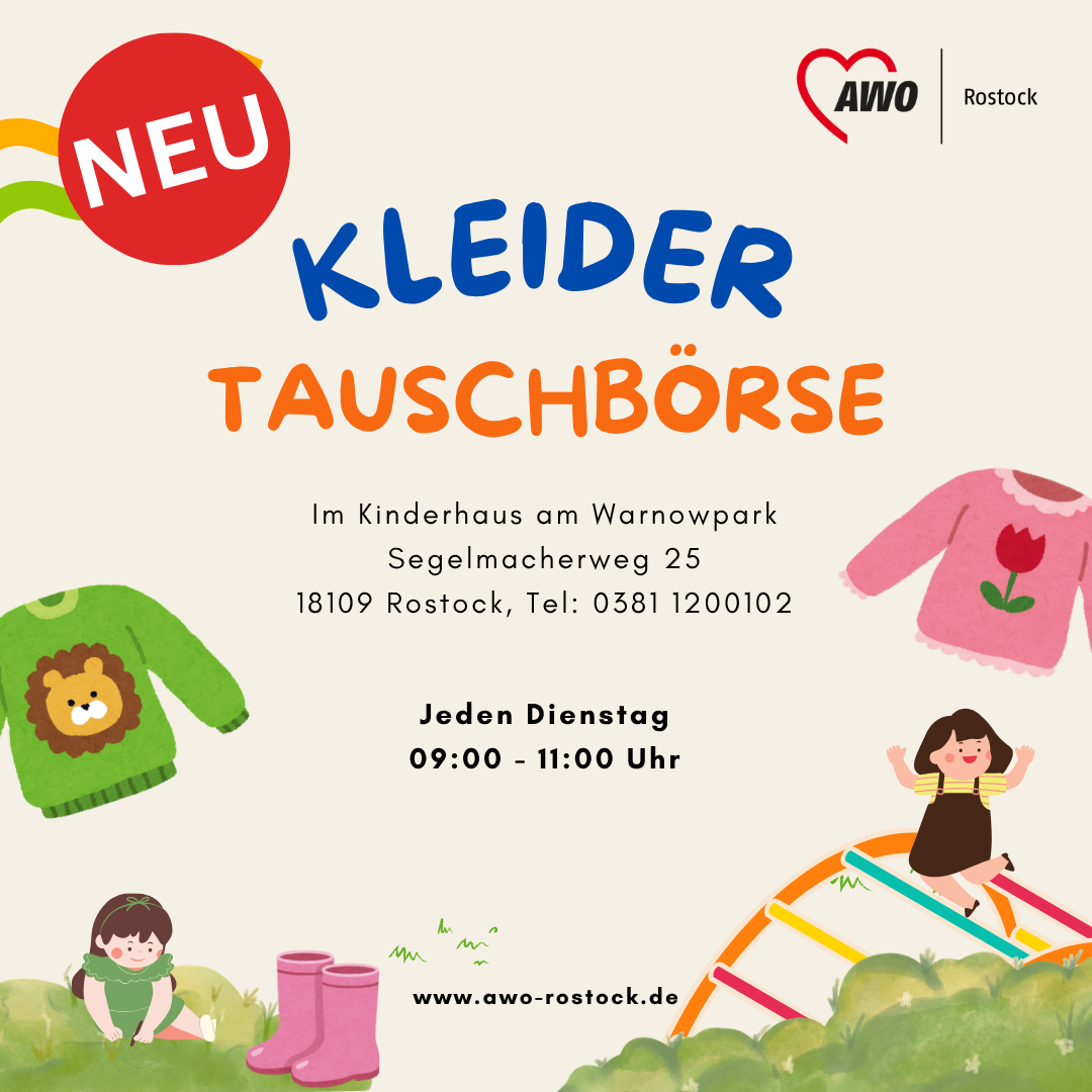 Kinder wachsen schnell aus ihren Sachen heraus, und oft sind Kleidung oder Spielzeug noch viel zu schade für die Tonne. Deshalb bietet die AWO Rostock ab sofort einen neuen Treffpunkt für Eltern an: Unsere Kleidertauschbörse.