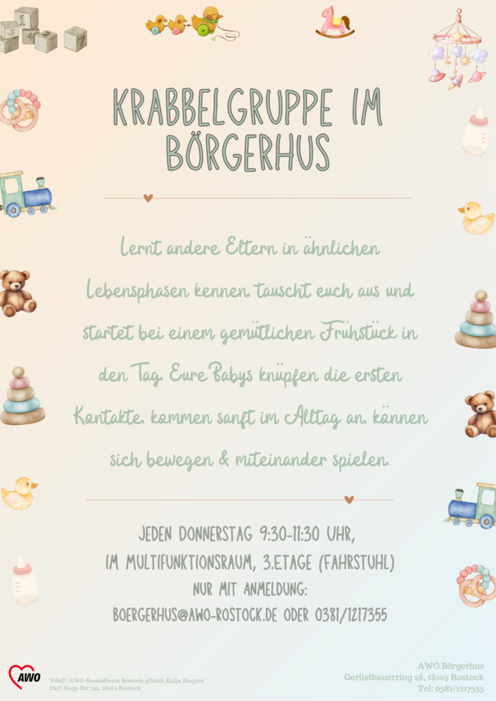 im AWO- SBZ Börgerhus in Groß Klein startet wieder eine Krabbelgruppe! Geplante Zeit: Donnerstags 9:30-11:30 Uhr. Wenn Sie Interesse haben, mit Ihrem Baby oder Kleinkind vorbeizuschauen und sich mit anderen Eltern auszutauschen, melden Sie sich gerne bei uns!