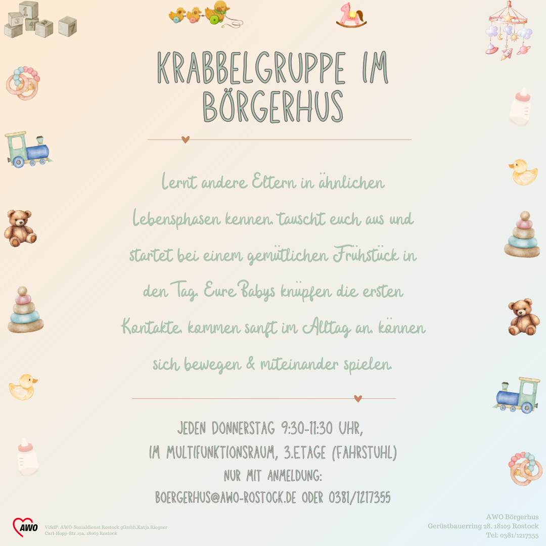 im AWO- SBZ Börgerhus in Groß Klein startet wieder eine Krabbelgruppe! Geplante Zeit: Donnerstags 9:30-11:30 Uhr. Wenn Sie Interesse haben, mit Ihrem Baby oder Kleinkind vorbeizuschauen und sich mit anderen Eltern auszutauschen, melden Sie sich gerne bei uns!