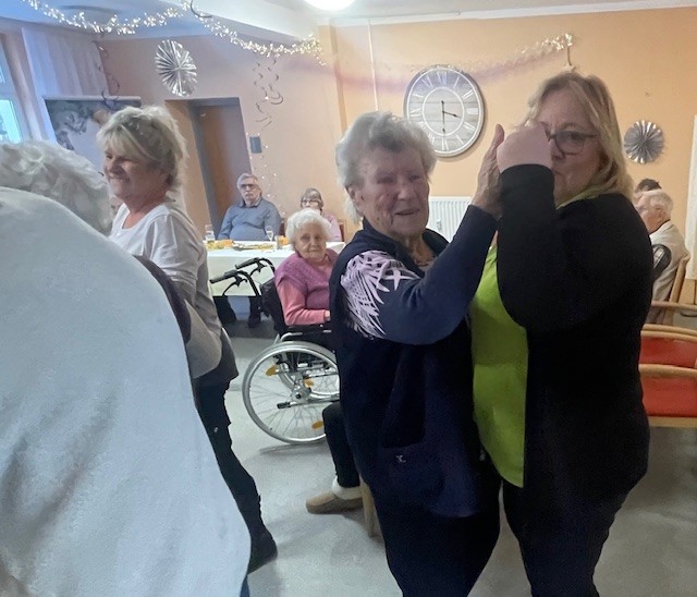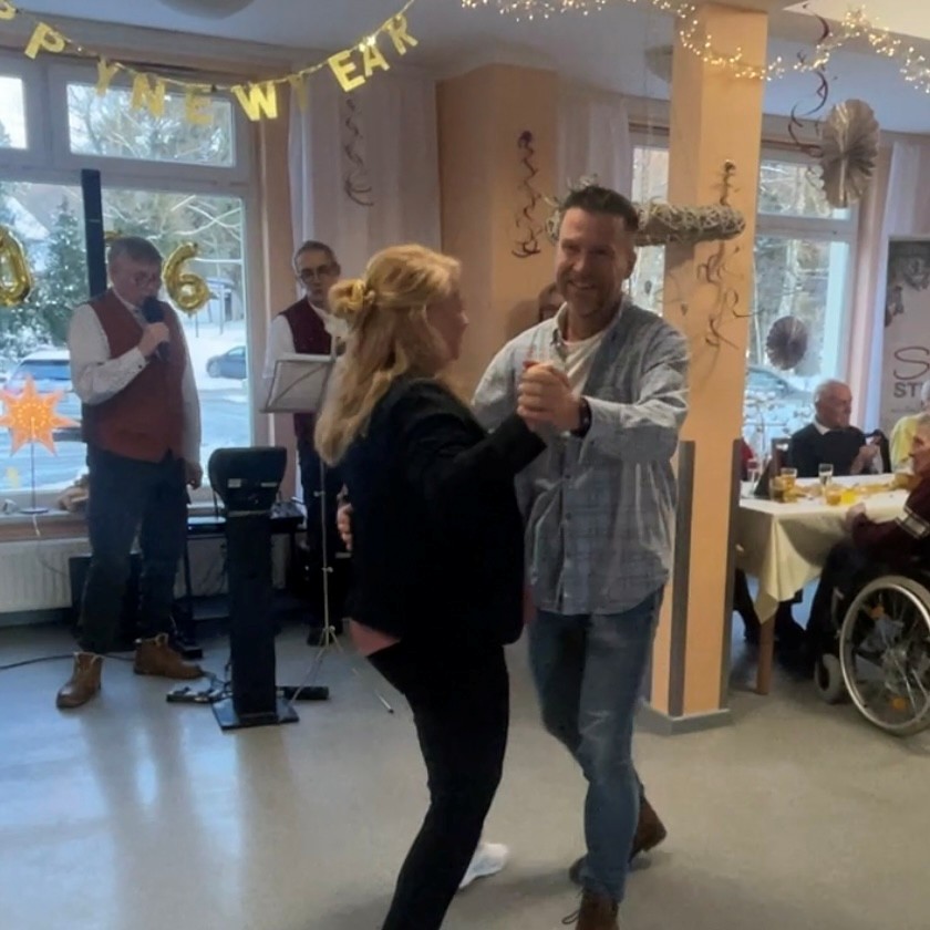 Nach dem offiziellen Teil stießen alle Anwesenden mit alkoholfreiem Sekt auf das neue Jahr an. Anschließend begann die Unterhaltung und der Tanz mit den Schlagerfreunden aus Rostock, Dietmar und Hartmut, die für ausgelassene Stimmung sorgten.